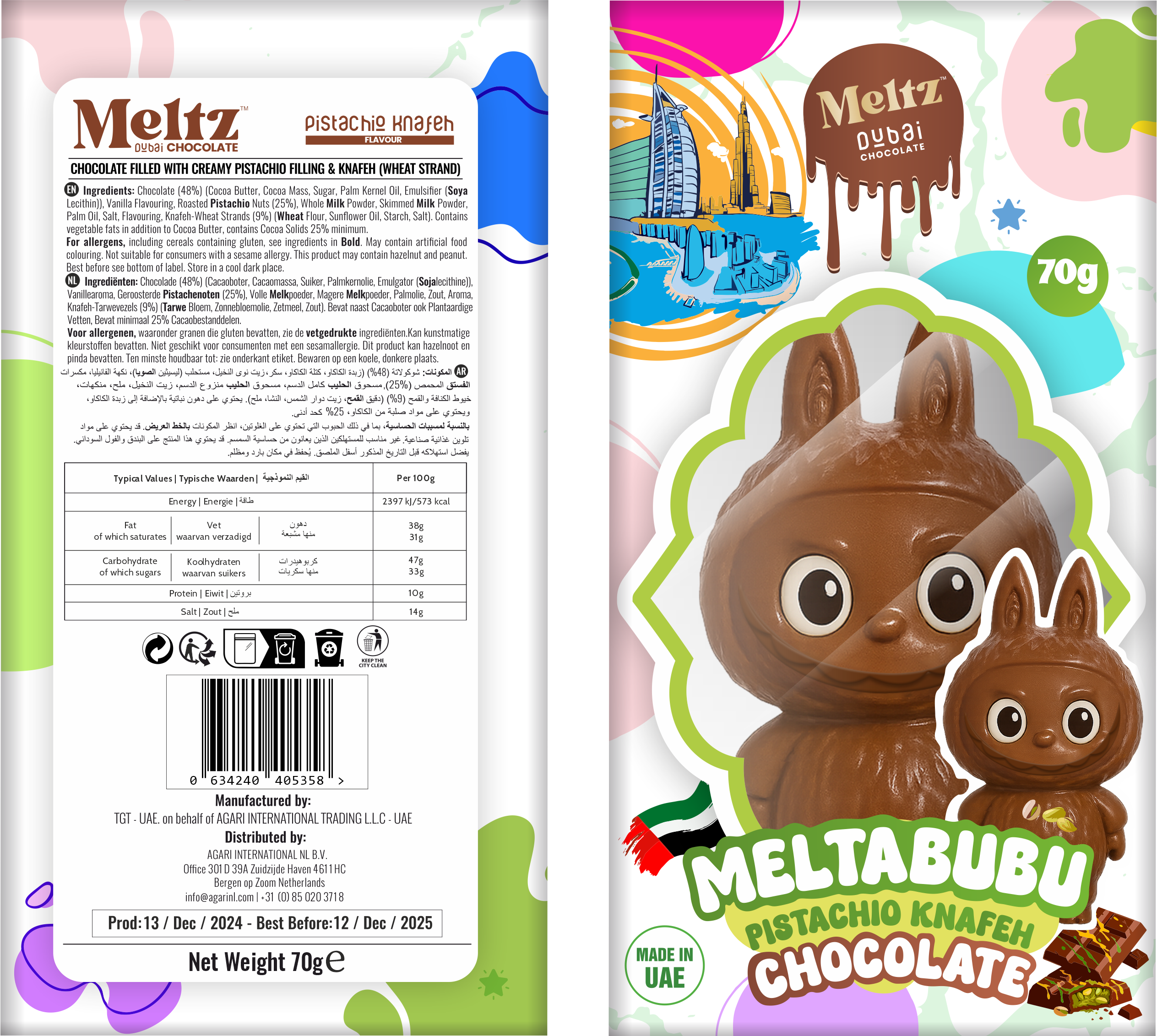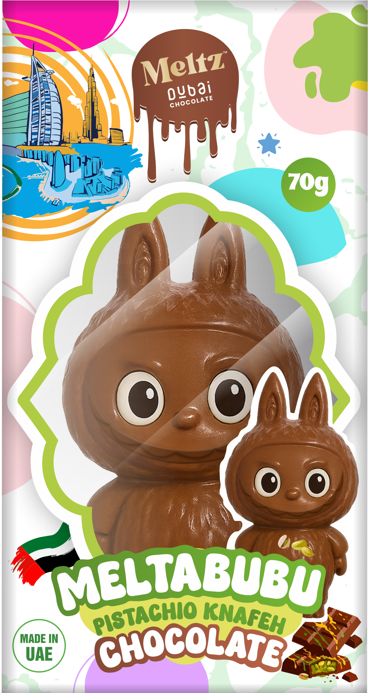 Discover the irresistible charm of Meltbubu — where silky chocolate meets the richness of creamy pistachio and the golden crunch of knafeh. A bite of pure indulgence that blends Middle Eastern heritage with modern sweetness, crafted to melt hearts and delight taste buds.